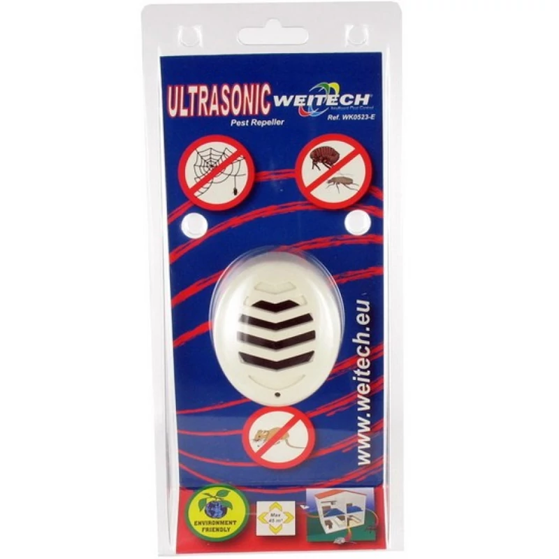 Weitech Ultrahangos kártevő riasztó 45 m2/hálózatról működik/egér,bolha,kullancs,pók/ Egér, bolha, kullancs, pók ellen (pók elleni hatása korlátozott) A kisállatelriasztó készülékek komplex „hangot” generálnak és bocsátanak ki nagyon magas hangfrekvencián (ultrahang), ill. magas intenzitáson. Ez az ultrahang emberi fül számára nem hallható, de a rágcsálók és a legtöbb bogár valamilyen módon hallja, illetve érzékszervével érzékeli ezt a magas frekvenciájú hangot. A folyamatos és váltakozó erősségű, frekvenciájú ultrahang megzavarja az állatok idegrendszerét felborítja egymás közötti kommunikácójukat, szokásaikat és megszakítja táplálkozási láncolatukat, melynek következtében nem találják meg prédájukat és elhagyják a készülékekkel védett területet. Az ultarhang ugyan úgy viselkedik, mint a hallható hang: kemény felületekről visszaverődik, és puha felületek elnyelik. Nem hatol át falon és a leghatékonyabban beltérben fejtik ki hatását. Üzembehelyezés és használat elektromos készülékek esetén: Egyszerűen helyezzük a készüléket bármely konnektorba. A készülék automatikusan működésbe lép, melyet a világító LED is jelez. A készülékhez nem szükséges karbantartás, vagy újratöltés. Működtesse a készüléket folyamatosan, amennyiben szükséges alkalmanként helyezze át másik konnektorba. A legjobb eredmény érdekében helyezzen el külön készülékeket az egymás melletti szobákba és az emeletekre.