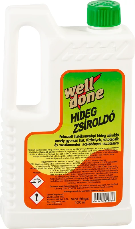 Fokozott hatékonyságú WellDone hideg zsíroldó utántöltő, amely gyorsan hat, tűzhelyek, sütőtepsik és rozsdamentes acéledények tisztítására.