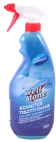 Habosított Well Done tisztítószer mindennemű szaniter elemre: fürdőkád, csempe, mosdó, WC. Eltávolítja a penészt és a vízkövet, magas fényt ad a felületeknek.