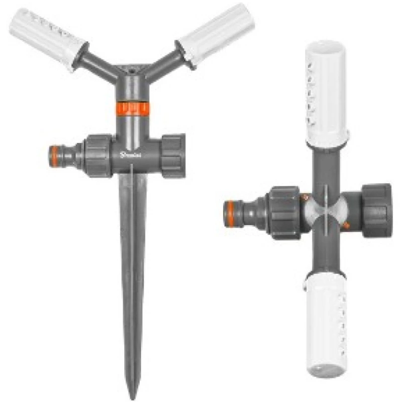 Egyszerűen használható leszúrható locsoló, amely akár 153 m²-es területet is lefed. Két ágának köszönhetően egyenletes vízelosztást biztosít, így ideális kisebb kertekbe, virágágyásokhoz vagy pázsitok öntözéséhez.