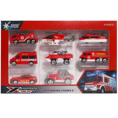 Ez a tűzoltós járműcsomag a kis srácoknak garantáltan elnyeri a tetszését, hiszen a készletben nyolc darab vagány tűzoltósági járgány található, amelyekkel igazán izgalmas bevetéseket és mentéseket lehet eljátszani, de a legtöbbet akár egy versenypályán is próbára lehet tenni. Ebben a csomagban nyolc szuper tűzoltó járgány található. A klasszikusan piros színű tűzoltójárművek között a gyerekek találhatnak helikoptert, légpárnást, páncélozott csapatszállítót és nyitott terepjárót is. A kisautók a részletgazdag kisdolgozásuknak és festésüknek köszönhetőn pont olyanok, mint az igaziak.