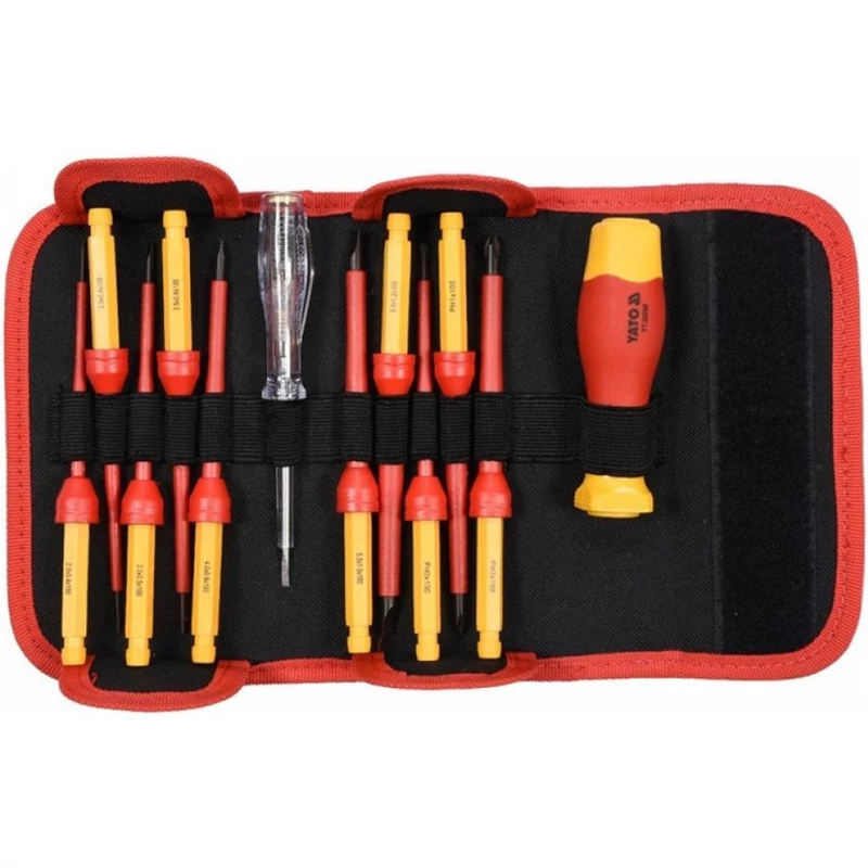 Csavarhúzó + bitek szett 12 részes YT-28290 VDE szigetelt nyéllel, tartós S2 acél pengével HRC keménységű 56-60. egy nyél több bithez ergonomikus ceruza doboz típusú csomagolás többkomponensű nyél VDE tanúsítvánnyal, ami 1000 V AC szigetelést biztosít A 12 részes csavarhúzó + bitek szett YT-28290-t tesztelték egy német VDE akkreditált vizsgáló laboratóriumban és megfelel az EN 60900 követelményeinek. CSOMAG TARTALMA Nyél Feszültségtesztelő PH: PH0, PH1, PH2 lapos: 6.5x1.2, 5.5x1.0, 4.0x0.8, 3.5x0.6, 3.0x0.5, 2.5x0.4, 2.0x0.4 mm