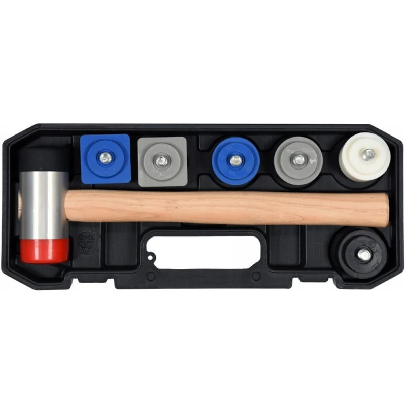 Csereélhető fejekkel ellátott szerelőkalapács, 8 különböző keménységű fejjel. A fejek tartós PI, PUR műanyagból készülnek. Alumínium alapú ötvözet kalapácsfej, melyet véglegesen egy 320mm hosszú fa nyélre erősítettek. A készletben kerek fejek 42,5mm átmérővel és négyzet alakú fejek 43x43mm méretben találhatóak. Az elérhető keménységek lehetővé teszik, hogy az eszközt a különböző anyagokkal végzendő munkához igazítsa. Szürke fejek - keménység kb. 65 hrc Piros végződések - keménység kb. 72 hrc Kék végződések - keménység kb. 73 hrc Fehér vég - keménység kb. 80 hrc Fekete fejek - keménység kb. 95 hrcBádogos, tetőfedő és szerelési munkákhoz. Használata alapos munka utánHasználata a kívánt keménységű és alakú fej gondos becsavarása után. Nyélre erősített fej, nyolc különböző keménységű fejjel. Használata a kívánt keménységű és alakú fej gondos becsavarása után. Használati figyelmeztetések: A kéziszerszámok használata veszélyes lehet! Mindig használjon személyes védőfelszerelést munka közben. Csak megfelelő és sérülésmentes szerszámokat használjon. Válassza ki a szerszám típusát és méretét a tervezett felhasználás szerint. Ne terhelje túl a szerszámokat. Tartsa a szerszámokat távol a gyermekektől. Gondosan használja a szerszámokat.