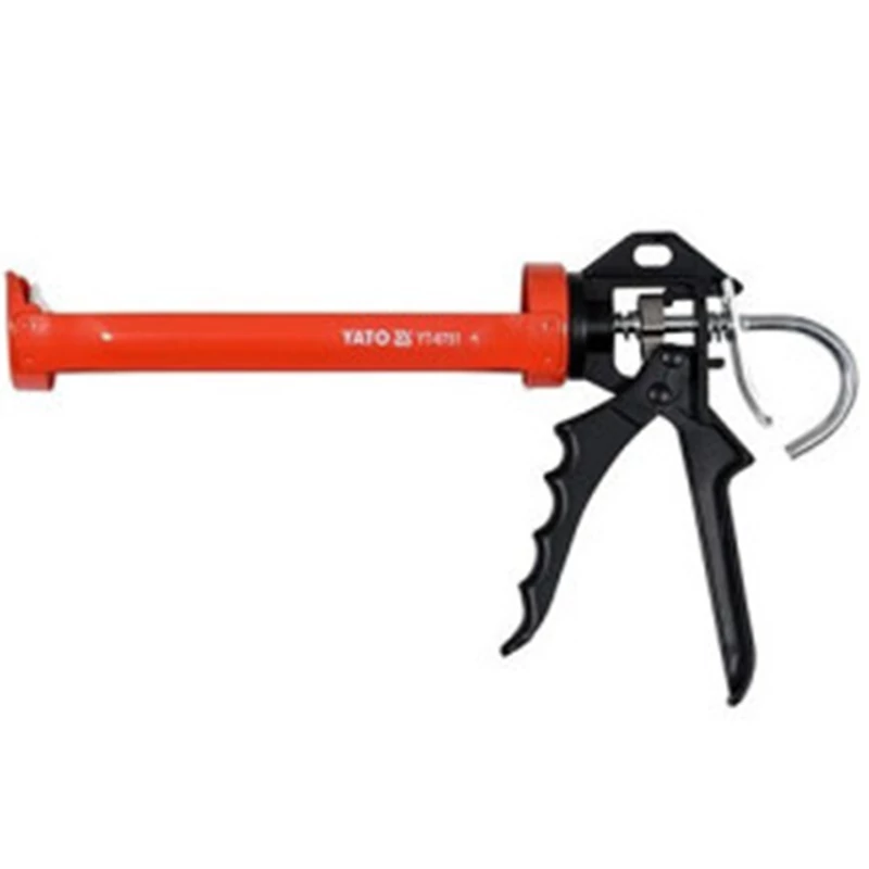 Szkeletális tömítőpisztoly, szkeletális típusú. Könnyű, acéllemezből készült, lakkozott. A kényelmes, profilált, ergonomikus alumínium fogantyú lehetővé teszi a sűrű anyagok, például ragasztók, tömítőanyagok, kenőanyagok stb. hatékony felvitele a tipikus 300 ml-es tartályokból. A sűrű anyagok pontos felvitelére / például szilikon préselésére /. Használati figyelmeztetések: Figyelem! Mindig használjon személyes védőfelszerelést a munka során.