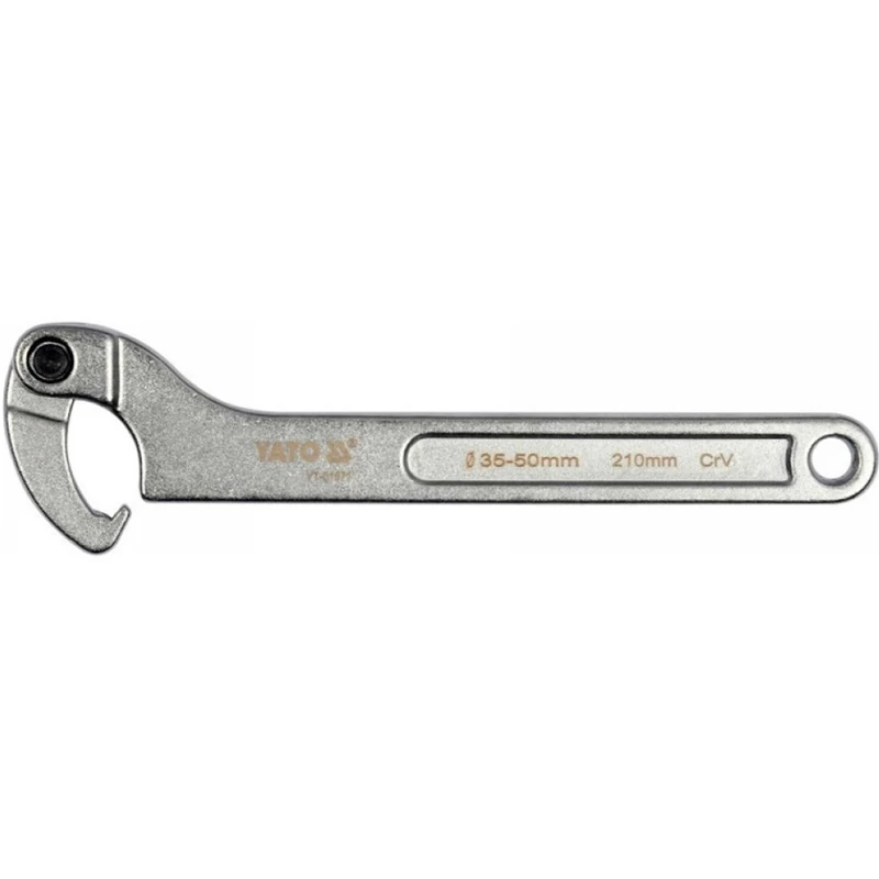 Horog és hurok, kapcsoló kulcs CrV króm-vanádium acélból készült. Matt krómbevonatú felülettel rendelkezik. Kerek horonyszerű anyákhoz tervezve. méret: 210 mm állkapocs nyitás: 35-50 mm anyag: CrV