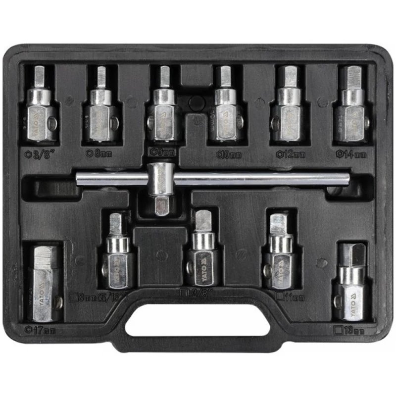 Olajdugó kulcsok, készlet. 12 db. Egy kulcskészlet, amely az olajleeresztő dugók ki- és behajtására szolgál az olajteknőben. A készlet egy kényelmes hordtáskában van csomagolva. Paraméterek: alkalmazás: olajdugókhoz a szerszám tartó mérete: 3/8' (9.5 mm) a készletben lévő darabok száma: 12 Használati figyelmeztetések: Figyelem! Mindig használjon személyes védőfelszerelést a munka során.