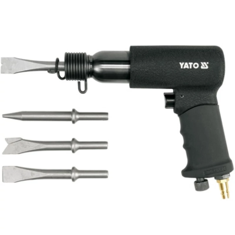 A pneumatikus kalapács egy olyan eszköz, amelyet sűrített levegő áramával működtetnek. A nyélhez rögzített vésők, szikék és tűk segítségével lehet vágni, faragni és lyukasztani a fémeket. A kalapács csatlakozóval rendelkezik, amely lehetővé teszi a pneumatikus rendszerhez való csatlakozást, további vésőkkel és tűkkel, valamint egy rugóval a szerszám helyes és biztonságos működéséhez. Súly [kg] - 1.5 Levegőcsatlakozás átmérője (PT) [” / mm] - 6.3 / 1/4 Levegőellátó cső átmérője (belső) [” / mm] - 10 / 3/8 Ütésszám [percenként] - 3200 A szerszám tartó átmérője [mm] - 10 Maximális működési nyomás [MPa] - 0.70 Ajánlott működési nyomás [MPa] - 0.62 Szükséges levegőáram (6.2 bar-on) [l/perc] - 560 Hangnyomás (ISO 15744) [dB(A)] - 96.9 ± 1.2 Hangteljesítmény (ISO 15744) [dB(A)] - 106.5 ± 2.0 Rezgés (ISO 28927-9) [m/s2 ] - 73.66 ± 7.79
