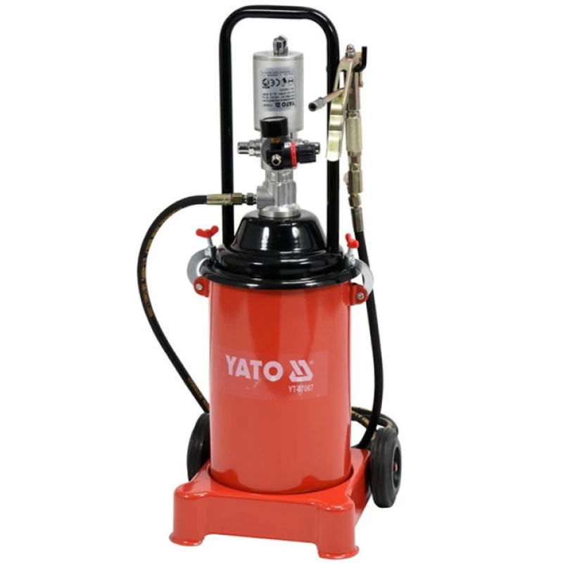 Teljesítmény YATO pneumatikus zsírpisztoly autószerelő műhelyek, mezőgazdaság, ipar számára. Gépek és berendezések karbantartásához tervezték, melyek rendelkeznek vészhelyzeti kenőrendszerrel. Kompresszorhoz csatlakoztatva független működést tesz lehetővé, második személy segítsége nélkül.Nyomás a pumpánál 8 bar tömörített levegő esetén: 300-400 bartömörítési arány: 50:1nagy zsírtartály: 12 lfém pisztollyal végződikrugalmas cső, 4 m hosszúságbankerekek a könnyű szállításért és manőverezésért