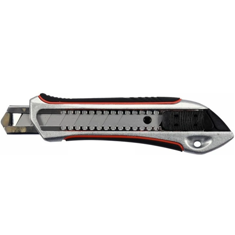 18mm törhető pengéjű kés. A kés teste különleges cinkötvözetből készült, ami hosszú élettartamot és ellenállást biztosít a mechanikai sérülésekkel szemben. Az ergonomikus fogantyú minőségi ABS anyaggal és TPR csúszásgátló bevonattal van ellátva. Ez biztos fogást és nagy kényelmet biztosít. A fém vezetősín gondoskodik a sima és problémamentes működésről. Továbbá felszerelték 'auto lock' rendszerrel, ami védi a pengét a véletlen kilökődéstől vagy visszahúzódástól működés közben, akár 20N erővel szemben. Az 'auto lock' rendszernek köszönhetően a kés tökéletes vastag anyagok vágására vagy szűk részekben, ahol fennáll a veszélye, hogy a penge beragad. A kés pengéje SK5 acélból készült, amely nagyon jó vágási teljesítményt és hosszú élettartamot biztosít. Használati figyelmeztetések: Figyelem! Mindig használjon személyes védőfelszerelést munka közben.