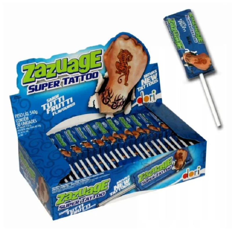 - Lemosható tetoválást tartalmazó nyalóka. Tutti-frutti ízben.